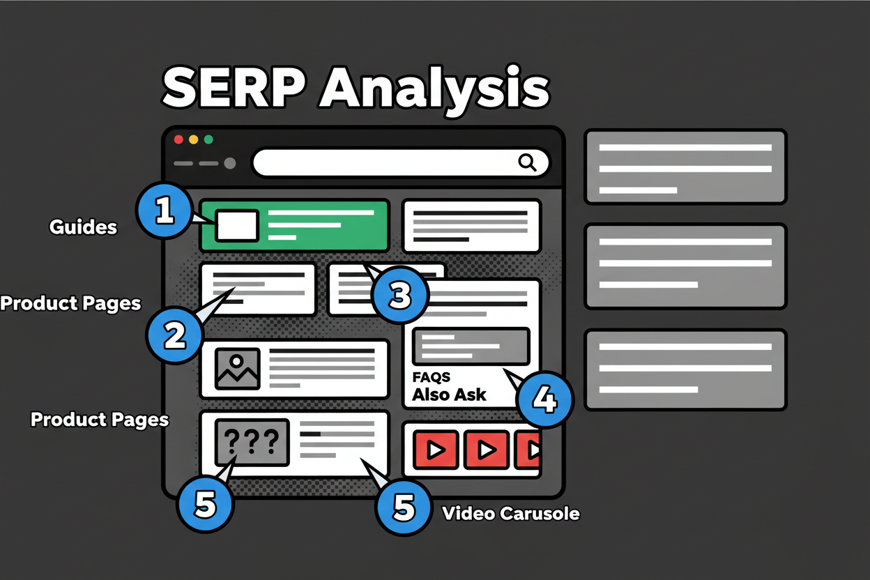 Start by mapping what the SERP rewards for each cluster. Are the winners comparison guides, tools, or product pages? Note recurring features like featured snippets, People Also Ask, videos, images, or site links. Pin down intent by what the top pages actually deliver, not by labels.