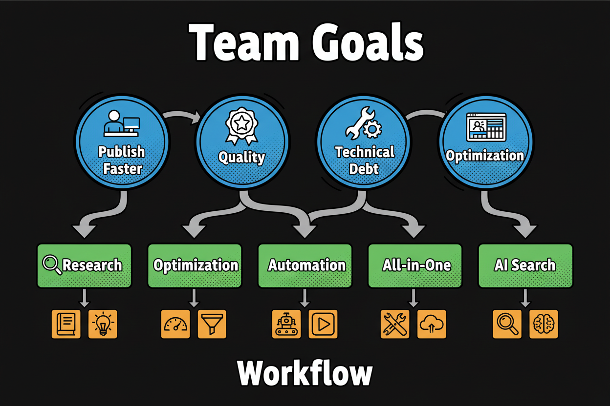 Start with goals and bottlenecks. Map your current workflow from research to reporting and mark where work slows or quality drops. Typical patterns: publishing speed stalls at briefs, content misses search intent, technical debt piles up, AI Overviews cut CTR, or reporting eats days. Write one sentence per bottleneck and add a measurable target, like reduce brief creation time by 50 percent or cut duplicative content by half.