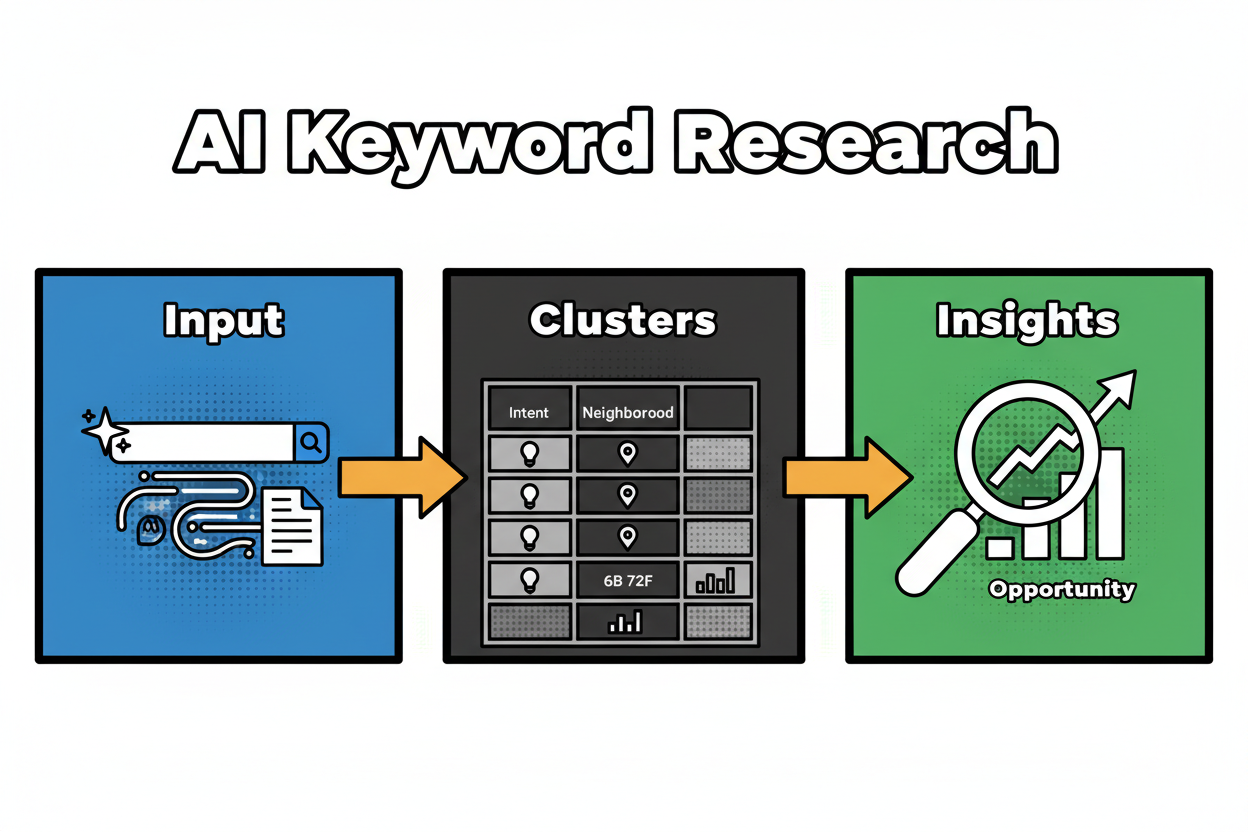| Keyword research | Manual brainstorming and tool exports | Missed local intent and slow iteration | NLP-driven clustering by neighborhood and intent, with competitor gap analysis | High |